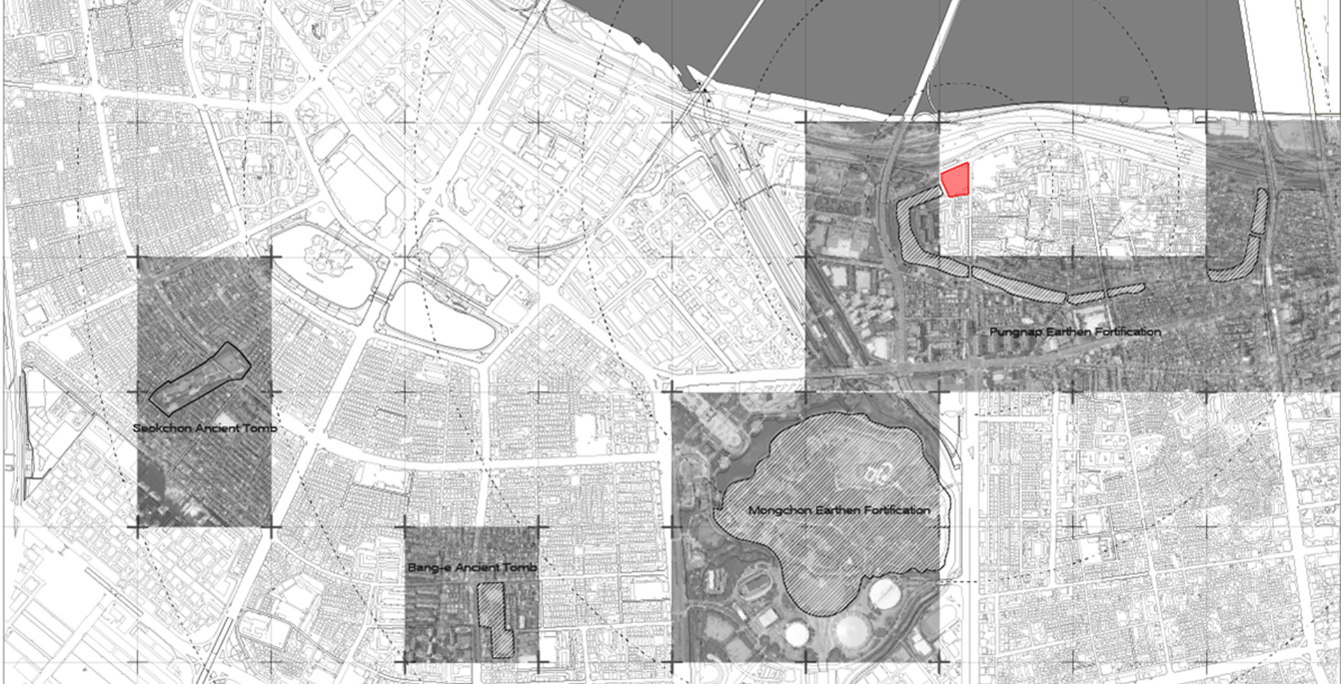 사이트인 송파구는 백제의 유구한 역사문화재들로 가득한 ‘백제문화권’이라 할 수 있다. 풍납토성의 가장 큰 특징은 문화재 위에 도시화가 동시에 진행되었다는 것이다. 문화재 위에 사람들이 자연스레 자리를 잡고 함께 공존해왔다. 발굴된 문화재를 보존하는 방법은 여러 가지가 있는데, 매장문화재보호 및 조사법에 따라 현장보존, 이전보존, 기록보존으로 구분할 수 있다. 2011년 발굴된 풍납성 동벽의 경우 풍납토성의 구조물 및 관련 유물이 출토되었으나 지역 보존을 위해 발굴 이전의 상태로 다시 복토되었고, 현재는 평범한 언덕으로 남아있다. 다만 묻힌 문화재를 다시 흙으로 덮는 행위는 일종의 역사적 파괴행위로 볼 수 있어 묻힌 문화재를 보존하고 후세에 남기 위해서는 보존계획을 재고할 필요가 있다. 따라서 본 프로젝트는 진정한 의미로서의 매장문화재와 도시의 공존에 대해 다룬다.