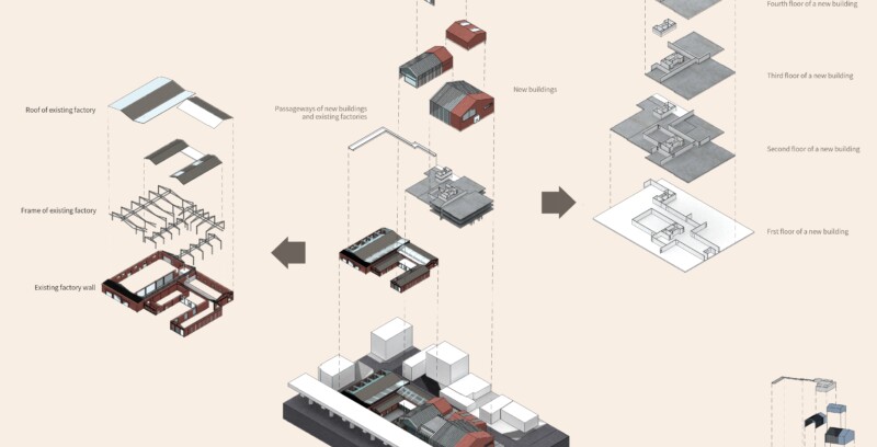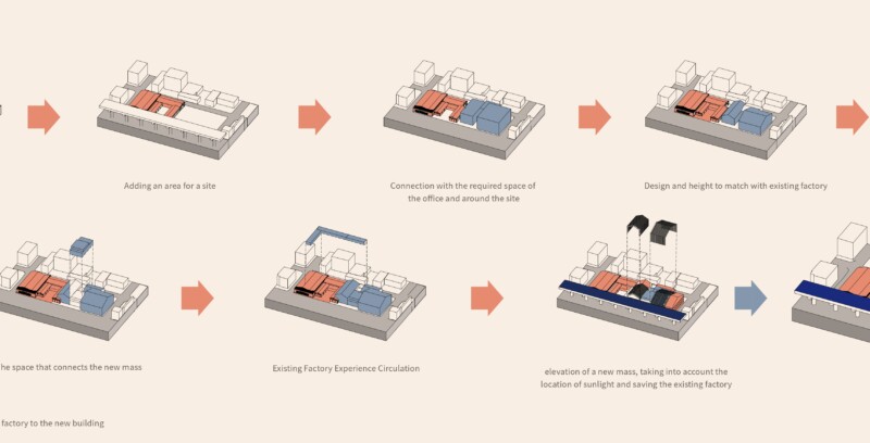 매스는 기존의 공장에서 옆에 부지를 확장하여 오른쪽에는 외부인들의 외부 오픈스페이스 오른쪽에는 오피스 사람들의 오픈 스페이스를 만들었고 면적은 기존 성수동 공장에서 느낄 수 있는 넓이를 사용하여 어디서나 성수동 공장의 공간감을 느낄 수 있게 하였다. 또한 기존의 건물과 새로운 건물들이 사용된곳에는 프레임을 밖에 보일 수 있게 배치해 기존 건물과 이어지는 부분을 강조하였다.