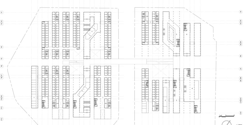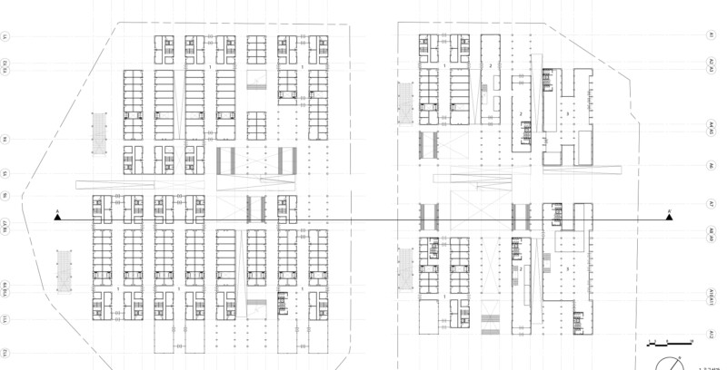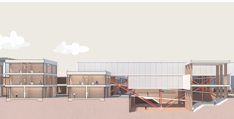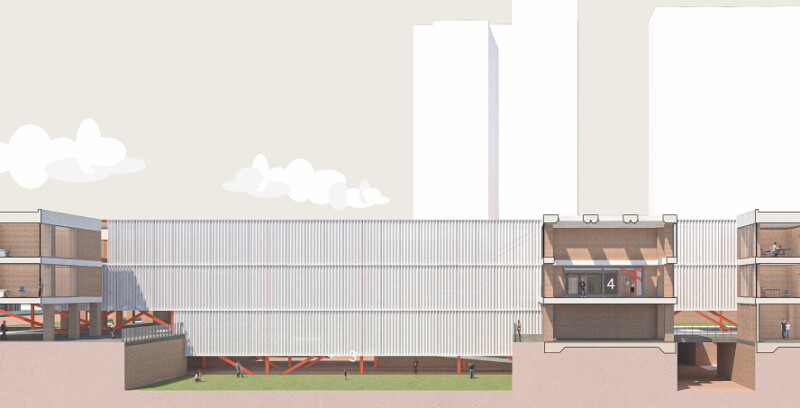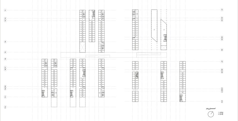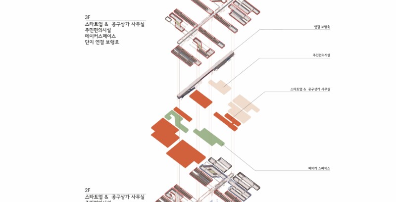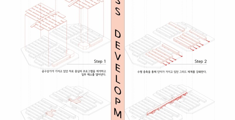 구로기계공구상가의 선형적인 그리드 구조를 유지하여 원래 가지고 있었던 역할을 일부 유지하고자 하였다. 그리고 선형구조속에서 일부를 밀어내어 Vold와 Sunken 공간을 만들어 다양한 프로그램을 담을 수 있는 가능성을 내포하는 공간들을 구성하려고 했다. 또한 이를 가로지르는 수평적인 축의 공간과 이를 통해 연결되는 수직과 수평의 동선들을 활용하여 다양한 공간이 유기적으로 연결되는 공간을 만들고자 하였다.