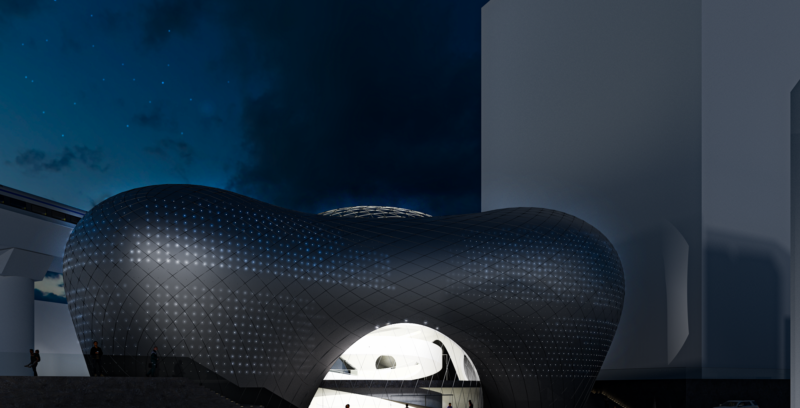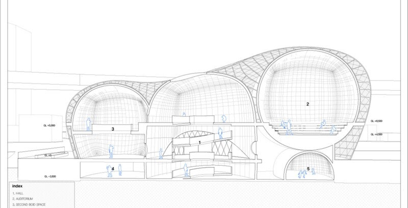 1번 구형공간은 자연광을 건축물 내부에 끌어들이며, 메인 도로에서 출입한 방문객을 각각의 프로그램 공간과 도시 내부의 공간으로 이동할 수 있게 하는 역할을 한다.