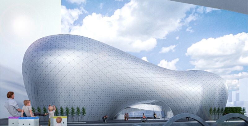 1번투시도는 메인 도로에서 본 건축물의 모습이며 기존에 위치한 분수와 다양한 외부공간과 연계되는 것을 보여준다.