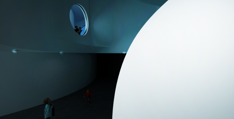 2번 구형 공간은 홀로그램을 통한 3차원 시각 전시가 일어나는 공간으로 각진 면이 없이 공간이 구성되어 방문객들이 효과적인 경험을 할 수 있도록 디자인 하였다.